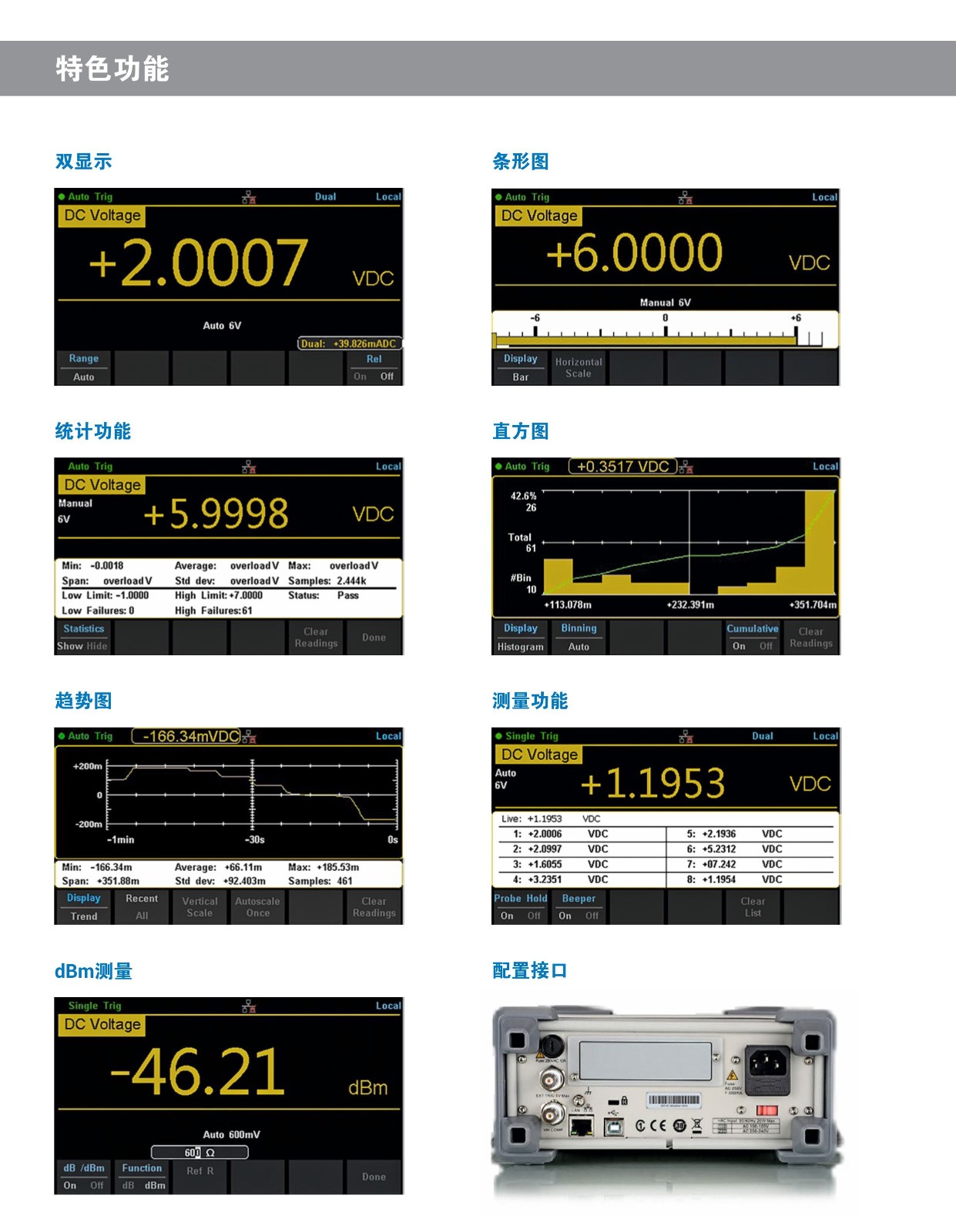 ● 最大值、最小值、平均值、標準差、相對測量、條形表,直方圖,趨勢圖,dB/dBm,限值等